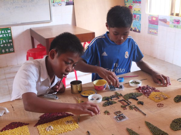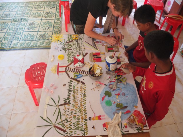 Depuis le mois de mars, les enfants préparaient « Recycling Cambodia ». A partir de matériaux recyclés en tous genres (bouteilles en plastiques, graines, verre, canettes, bouchons, cartons, bois…) ils ont composé des œuvres d’art, 9 au total. Certaines représentent des scènes de vie au Cambodge en général ainsi qu’au Foyer, tandis que d’autres reprennent un élément prépondérant de leur quotidien et est transformé artistiquement, tel que le poisson à la manière d’Andy Warhol. Ils ont eu la chance d’être accompagnés par Adèle, bénévole en art plastiques pendant un mois et Marie-Claude, professeur d’art au Foyer depuis de nombreuses années. Les enfants nous ont épatés par leur incroyable talent et leur créativité ! Nous avons également réalisé des bijoux recyclés destinés à la vente pour l’inauguration et pendant toute la durée de l’exposition au « Choco L’Art Café » de Battambang.