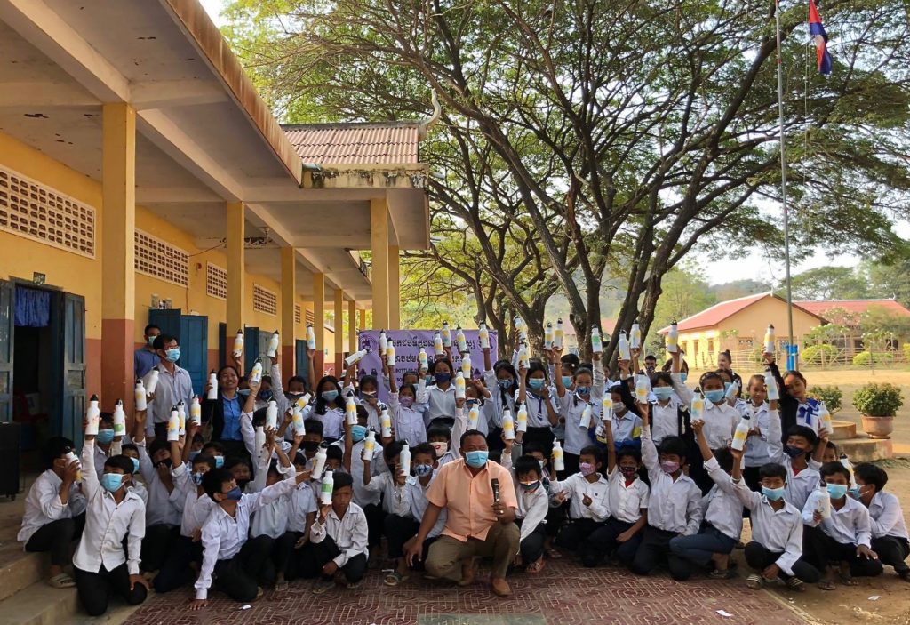 AEC-Foyer Lataste continue sa campagne de sensibilisation contre le fléau du plastique au Cambodge et distribue 400 gourdes aux enfants et professeurs de